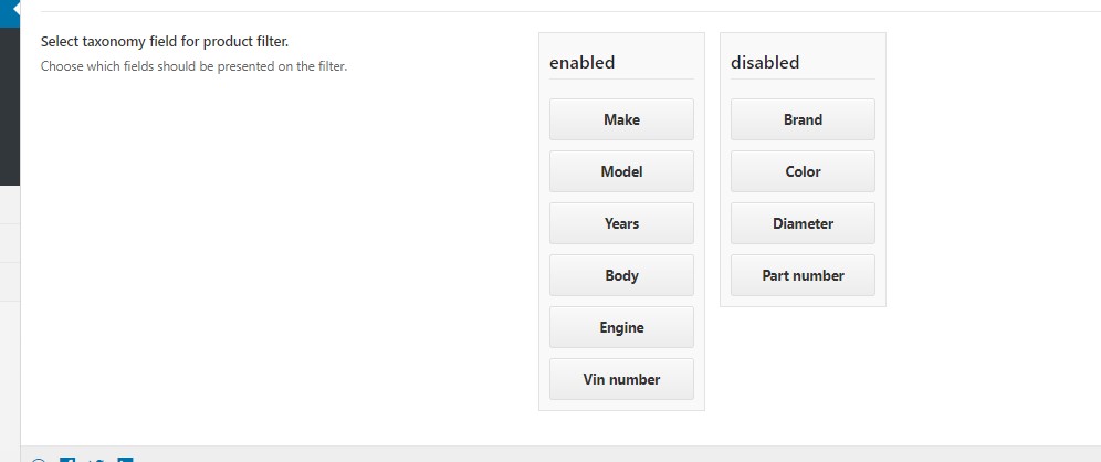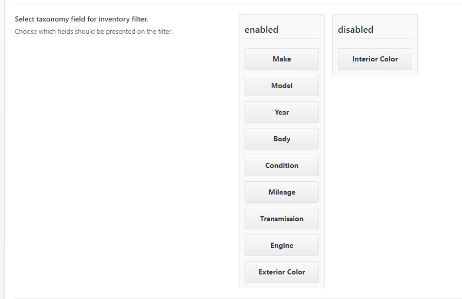 Select taxonomy field for inventory filter: Choose which fields should be presented on the filter by the way drag and drop mouse field from "Disabled" to "Enabled" tab